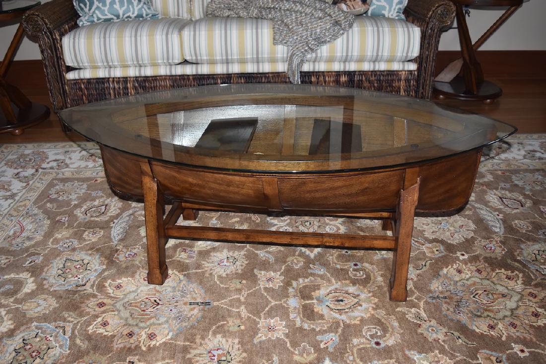 Canoe Coffee Table - Furniture : An authentic 5′ cedar canoe has been converted into a beautiful table with a full glass top and cherry stand.. Straight freight shipping surcharge for sku 3005030164 is $10.00 per unit shipped. A coffee table that is certainly stylish and unique, it will perfectly accent any den, family room or living room in your home. 5 out of 5 stars. Coffee table low table where magazines can be placed and coffee or cocktails are served; Solid wood and glass 53w x 16 1/2d x 19 1/2h ~ ships from the manufacturer.